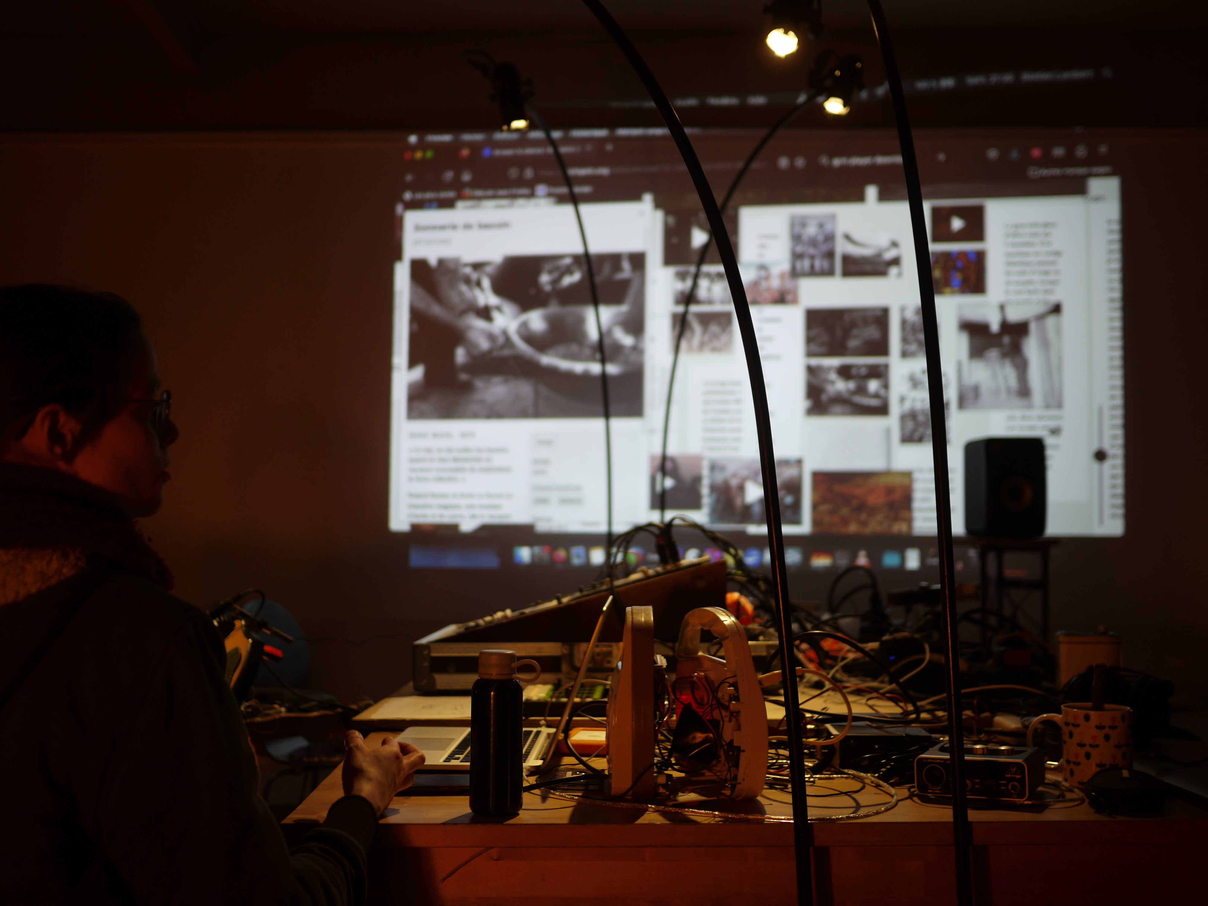 A la suite d'une résidence, Marion Cros et Bastien Lambert (créateur.ice.s sonores, radiophoniques, et instrumentistes) présenteront travaux en cours et oeuvres passées entrecoupés de pièces sonores et vidéos choisies par elleux.